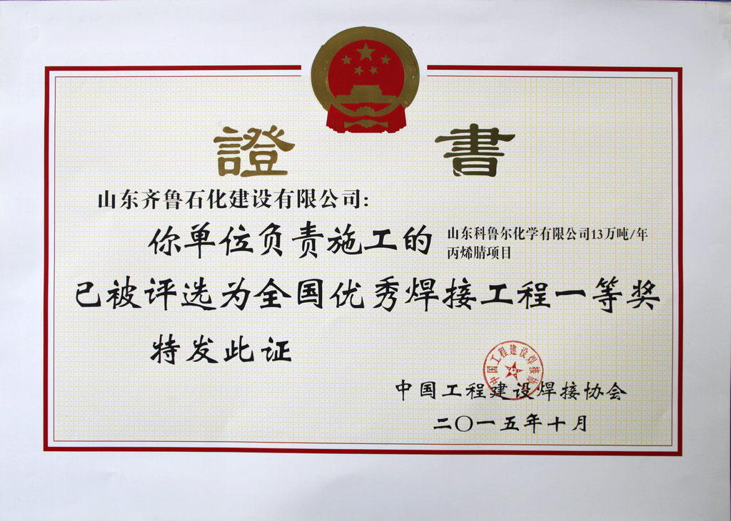 全國優質焊接工程-山東科魯爾化學有限公司13萬噸/年丙烯腈項目