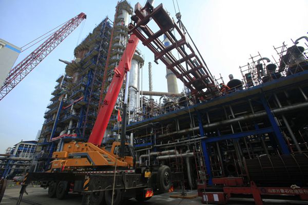 四年一次的齊魯石化大檢修正激戰猶酣。齊魯建設作為主力軍承擔了煉油廠、烯烴廠等8個生產廠34套生產裝置、5200多項檢修改造任務,承擔的吊裝施工作業占大修改造總吊裝任務的85%以上。多區域多裝置同步作業,共投入了650噸、500噸、260噸、160噸等各類大型吊車70余臺,為歷次大檢修之最。